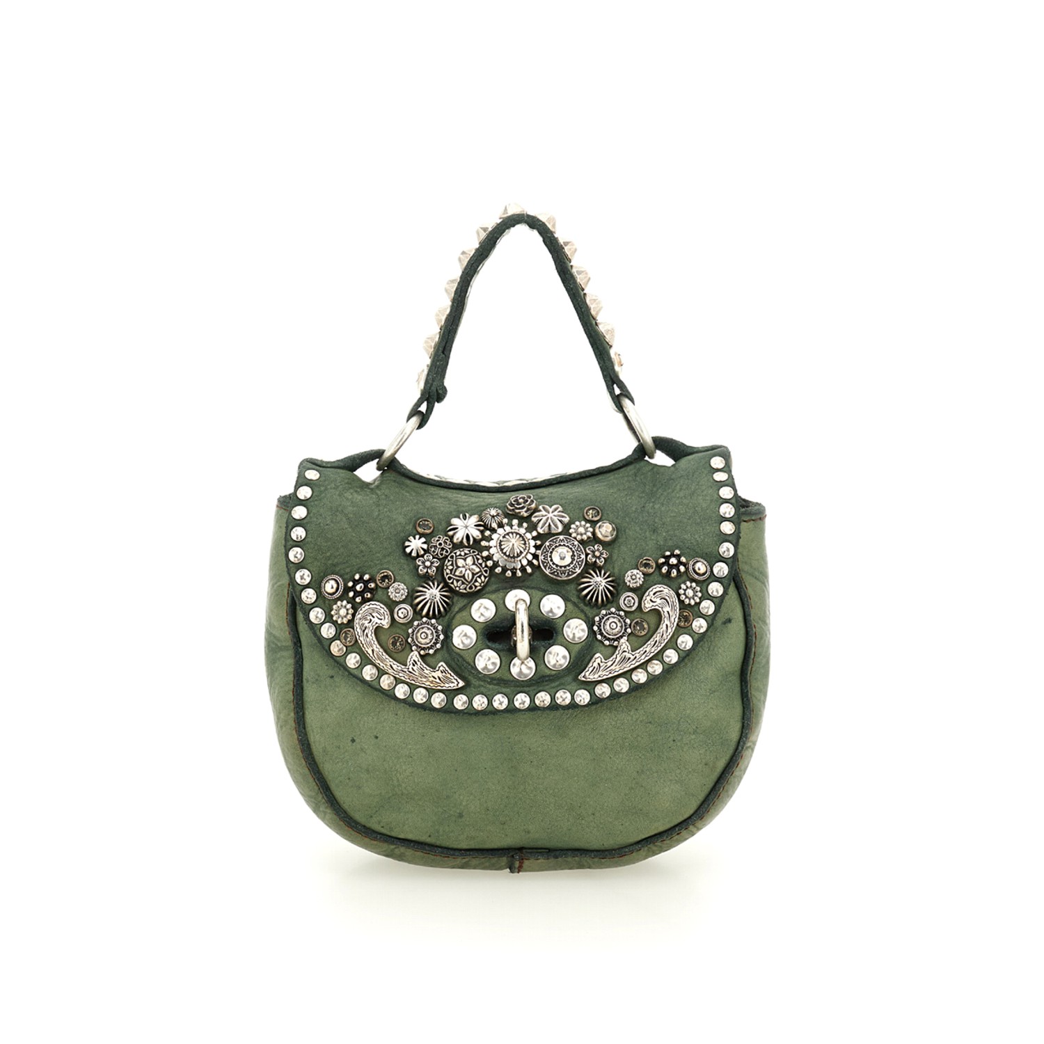 CAMPOMAGGI ДАМСКА КОЖЕНА КРОСБОДИ ЧАНТА AFRODITE С КАПСИ И КАМЪНИ В ЗЕЛЕНО