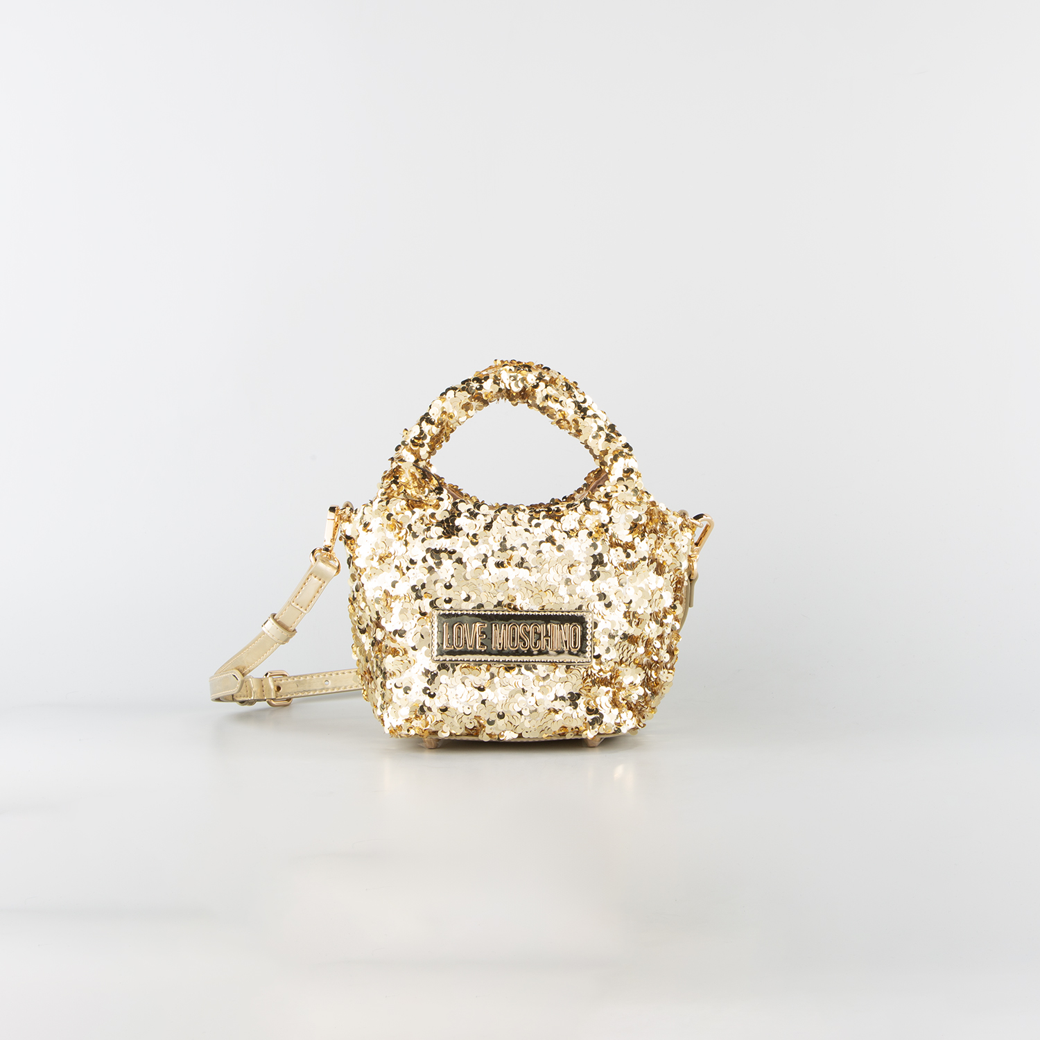 LOVE MOSCHINO БЛЕСТЯЩА МИНИ ДАМСКА ЧАНТА С ПАЙЕТИ В ЗЛАТИСТО