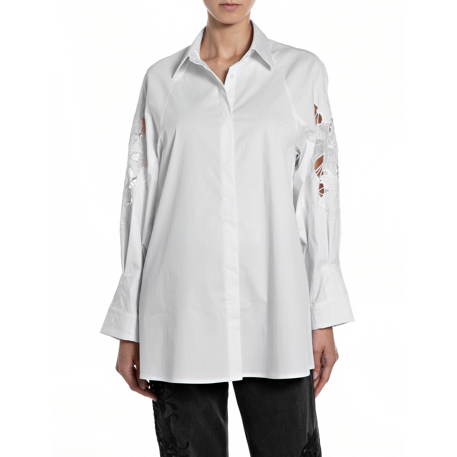 REPLAY ДАМСКА РИЗА COMFORT STRETCH POPLIN SHIRT WITH LACE ON SLEEVES В БЯЛ