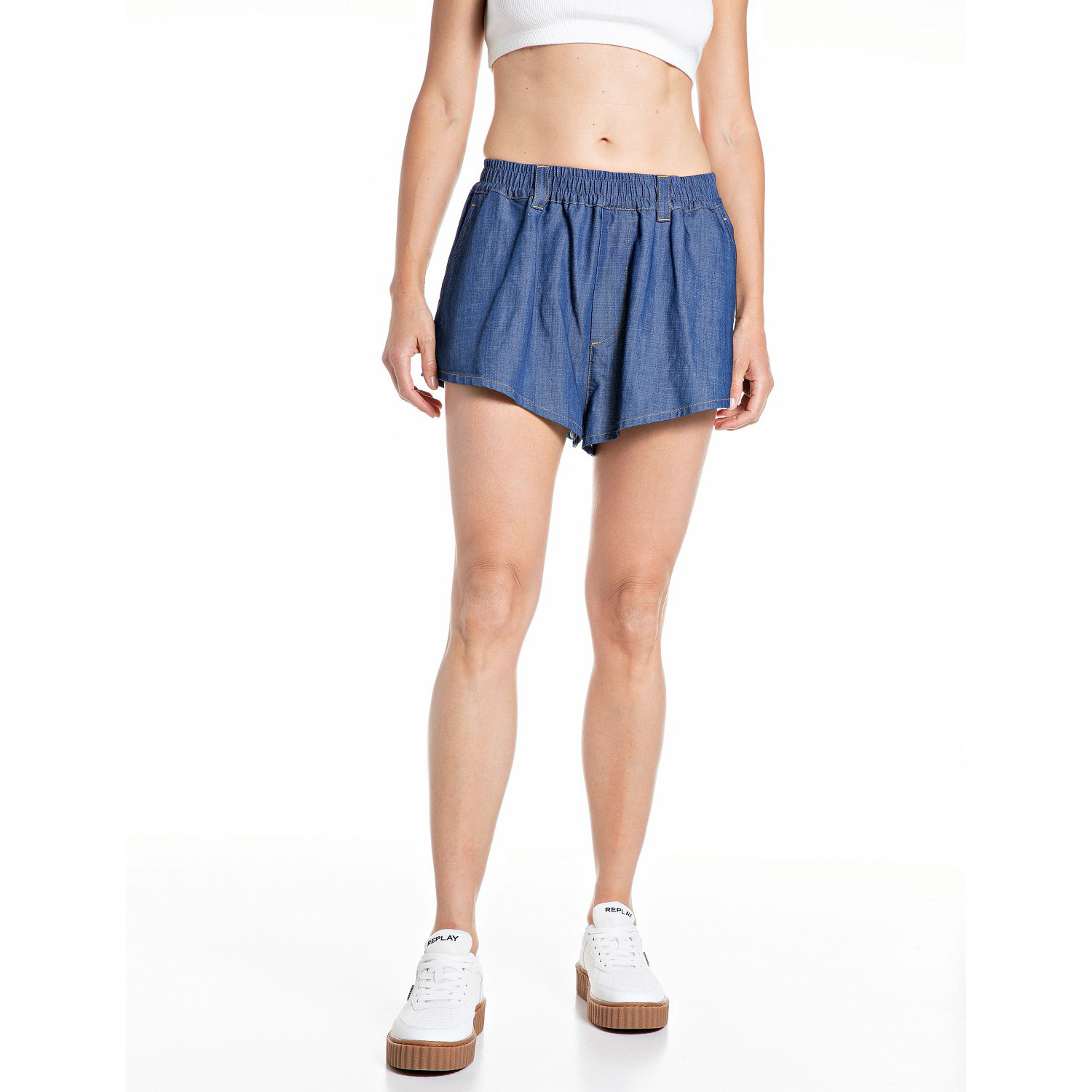 REPLAY ДАМСКИ БЕРМУДИ WIDE 8 OZ VISCOSE DENIM SHORTS В ТЪМНОСИНЬО