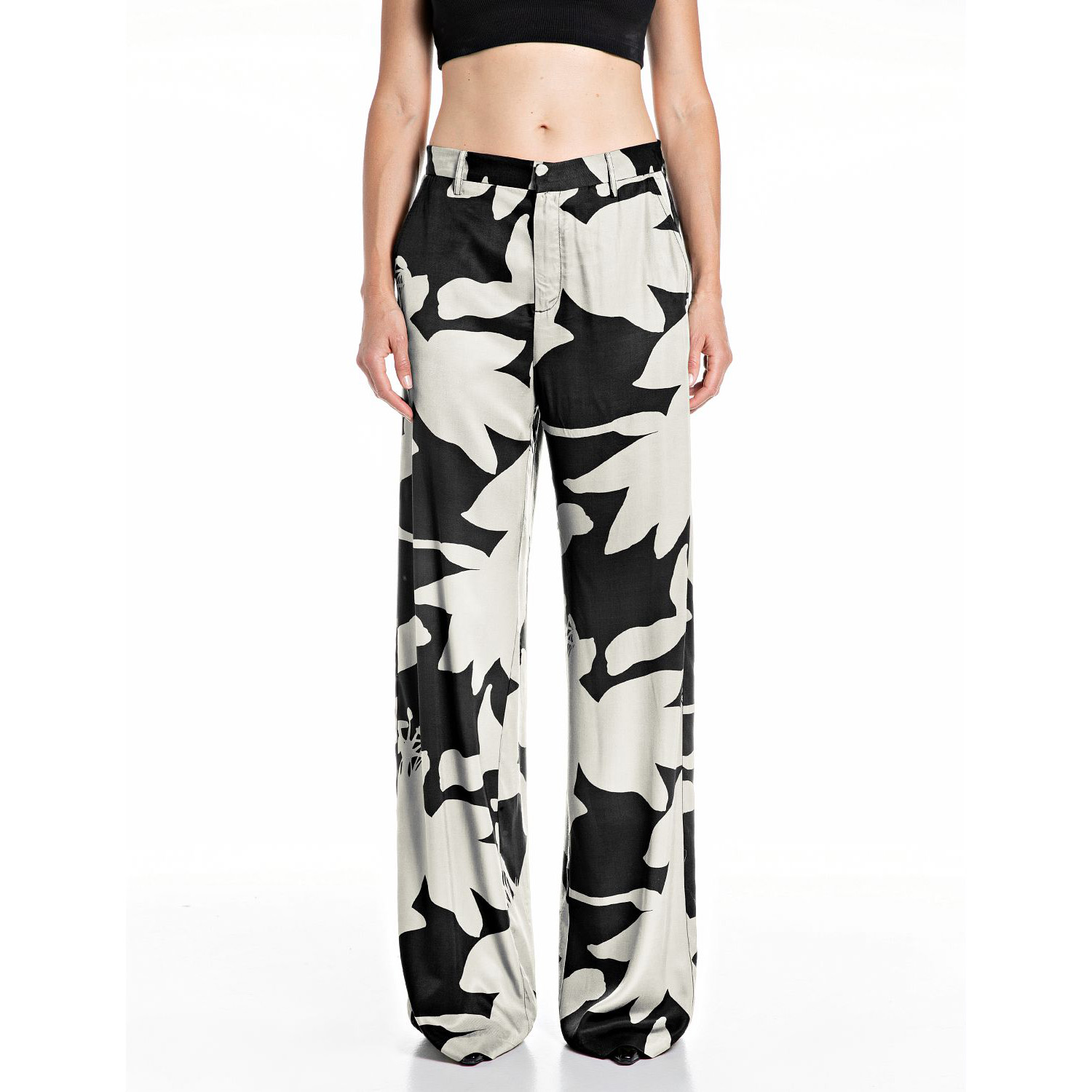 REPLAY ДАМСКИ ПАНТАЛОНИ WIDE-LEG TWILL TROUSERS WITH FLOWER PRINT В МАСЛЕНО/ЧЕРНО