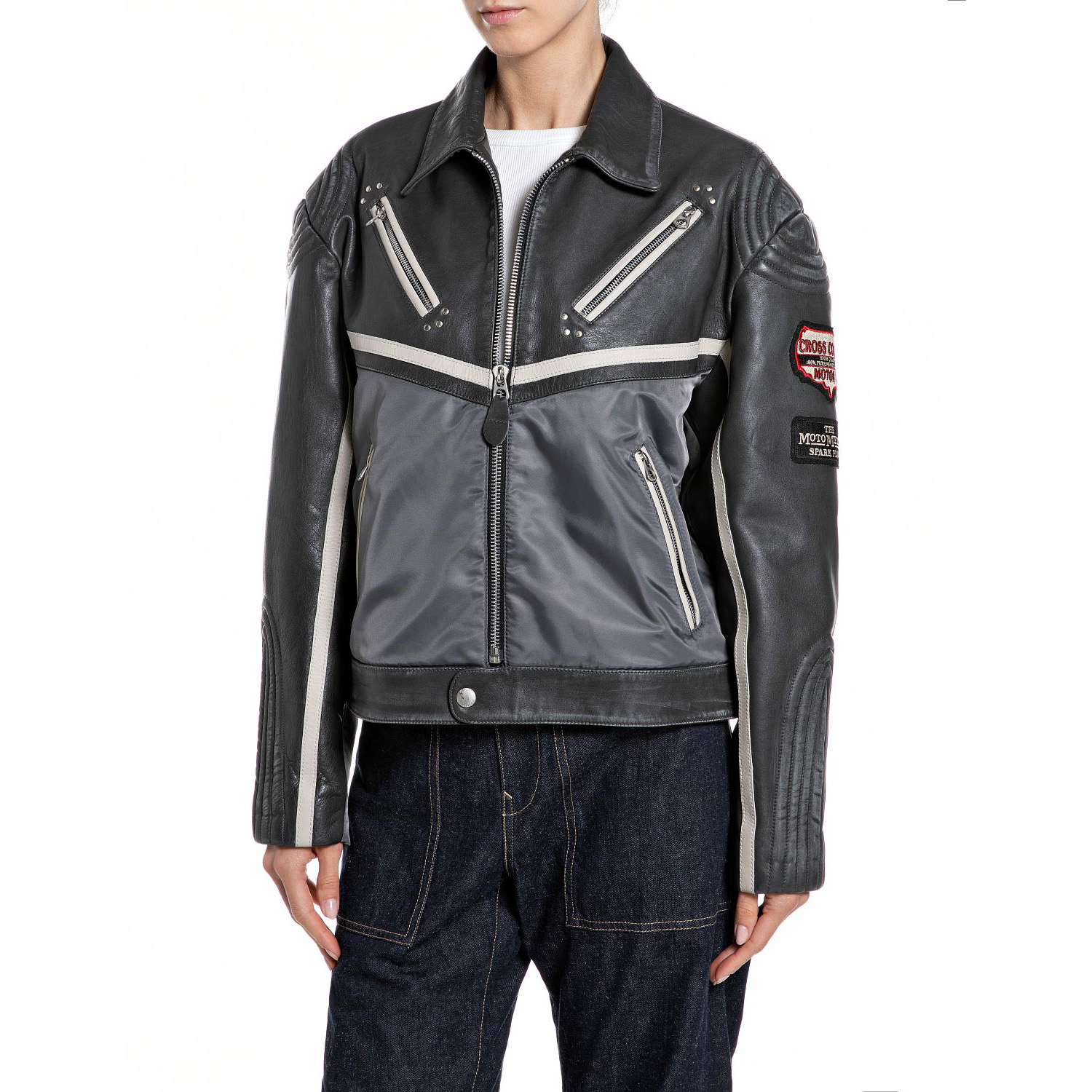REPLAY WOMEN'S BOY-FIT MIX LEATHER&NYLON BIKER JACKET В ТЪМНОСИВО/СВЕТЛОСИВО/МАСЛЕНО