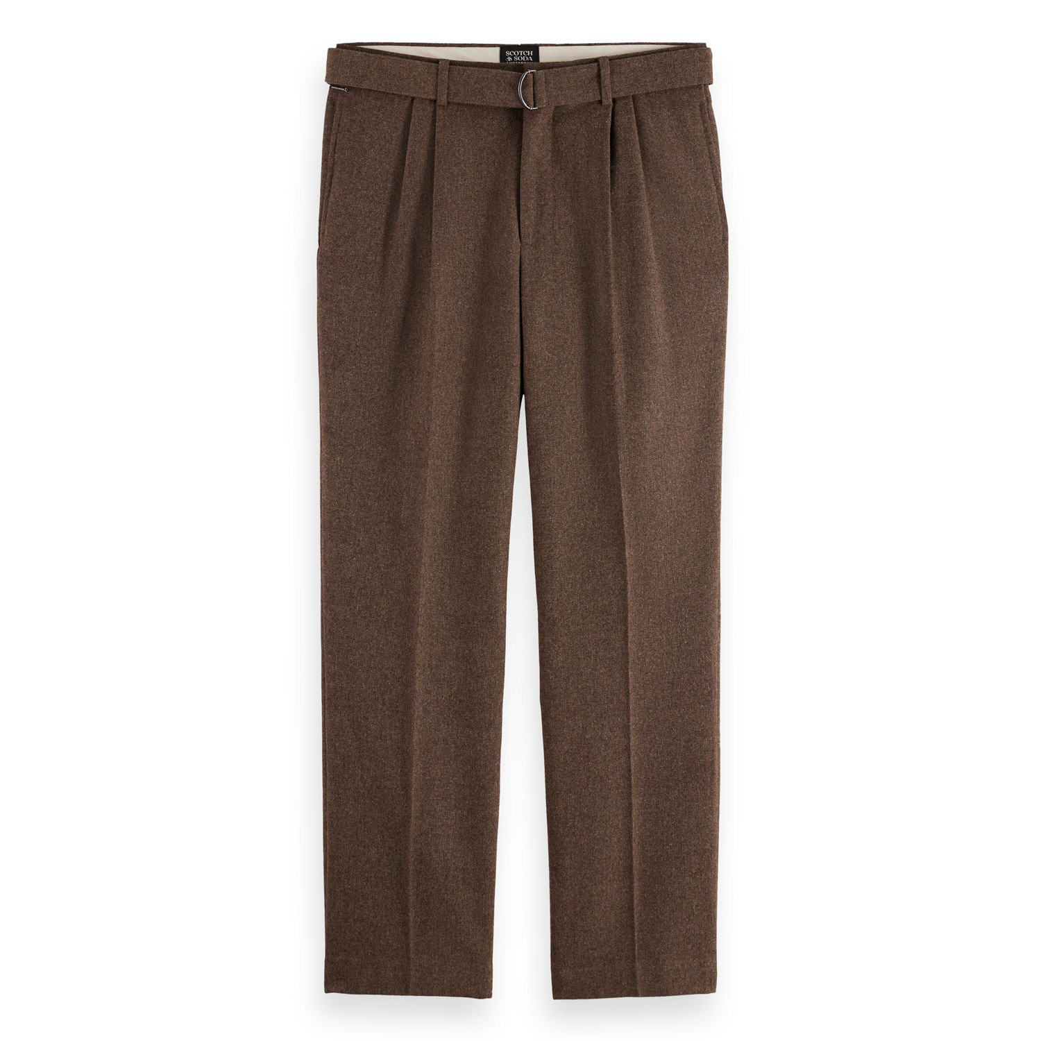 SCOTCH&SODA MEN'S YARN-DYED WOOL BLEND RELAXED STRAIGHT PLEATED CHINO IN DARK BROWN