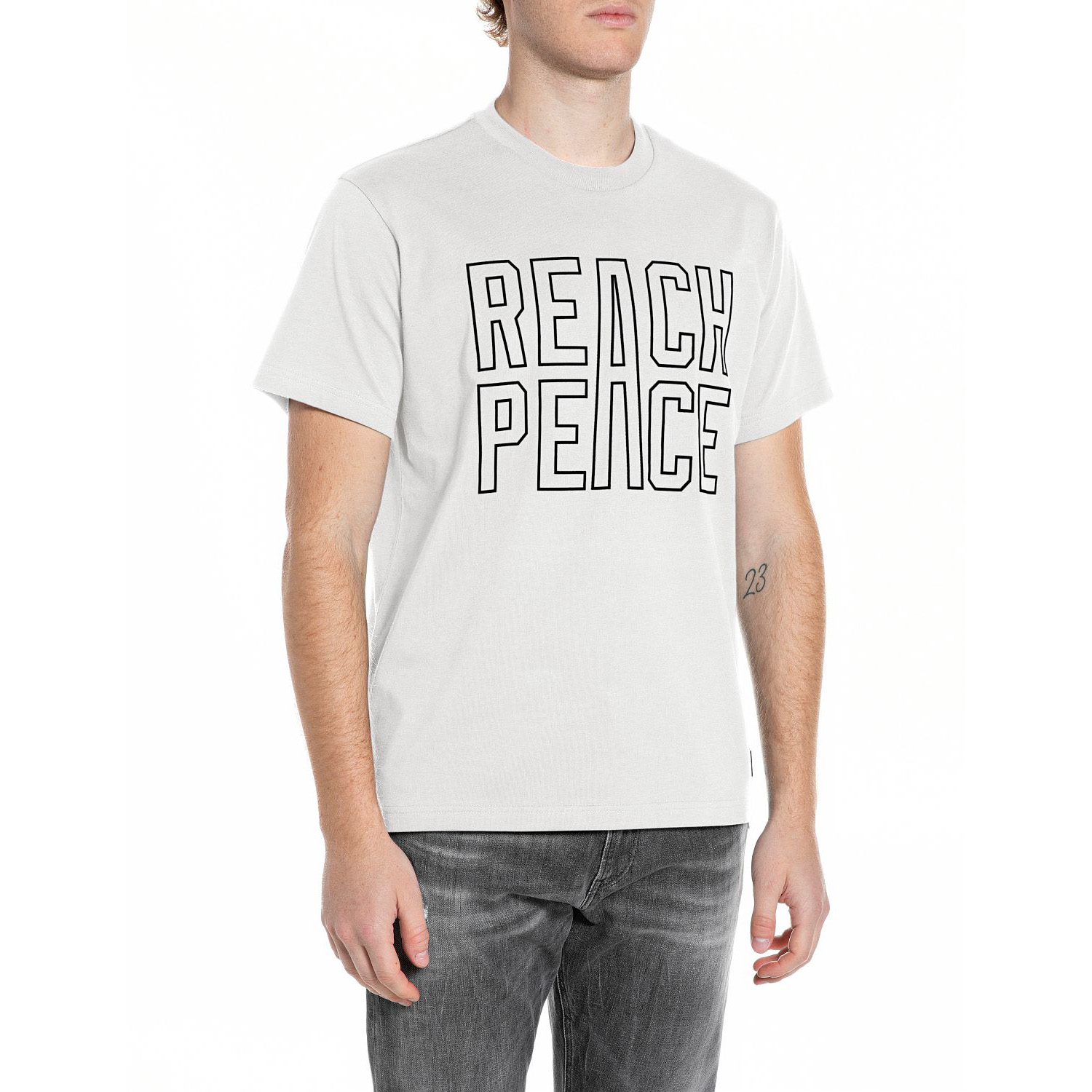 REPLAY MEN'S REGULAR FIT JERSEY T-SHIRT WITH REACH PEACE PRINT IN NATURAL WHITE