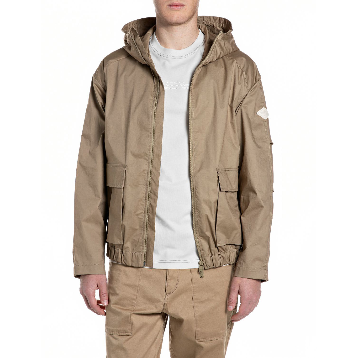 REPLAY MEN'S RELAXED-FIT TWILL JACKET WITH HOOD IN LIGHT COFFEE