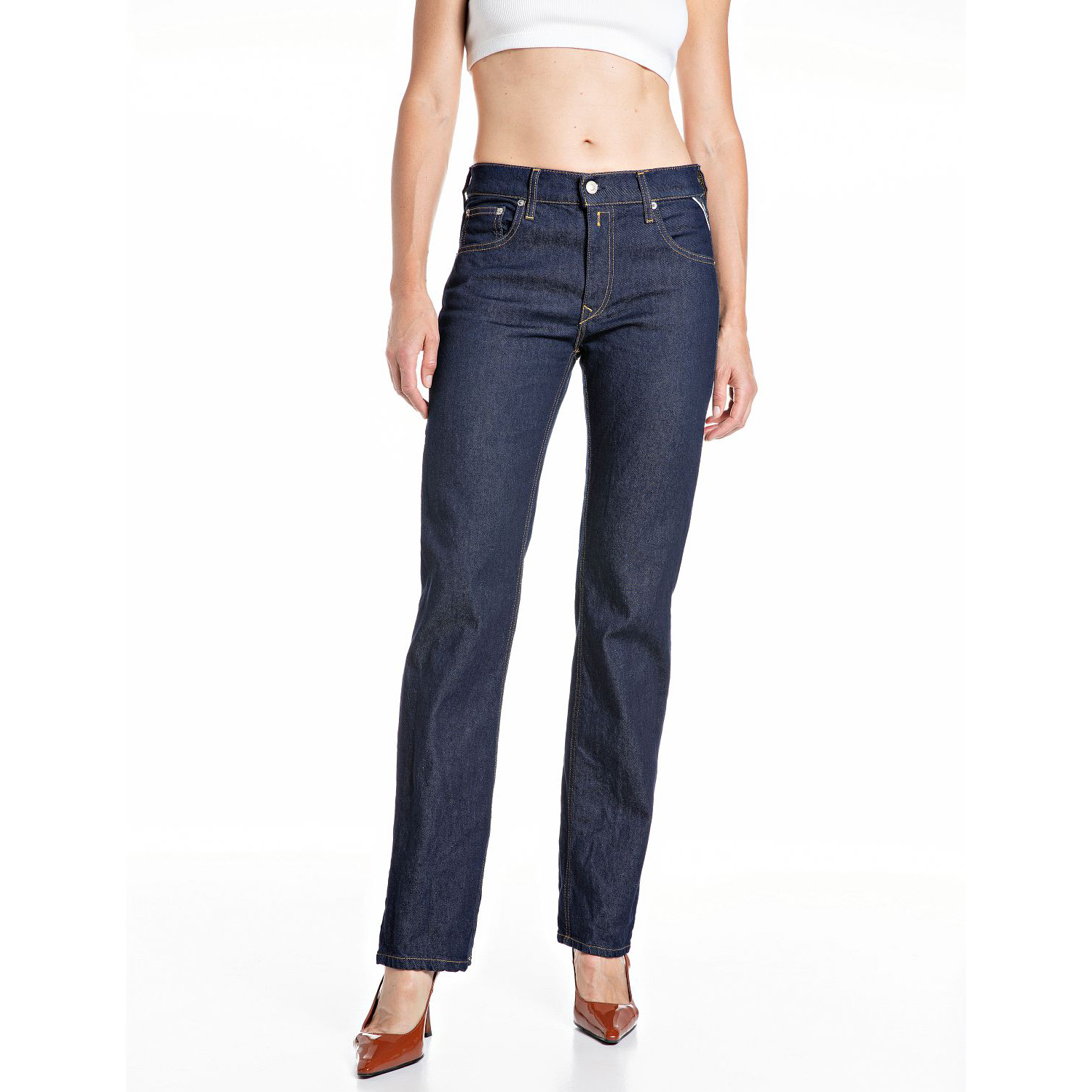 REPLAY WOMEN'S AKEME STRAIGHT FIT JEANS 12 OZ COTTON/LYOCELL STRETCH INDIGO IN DARK BLUE