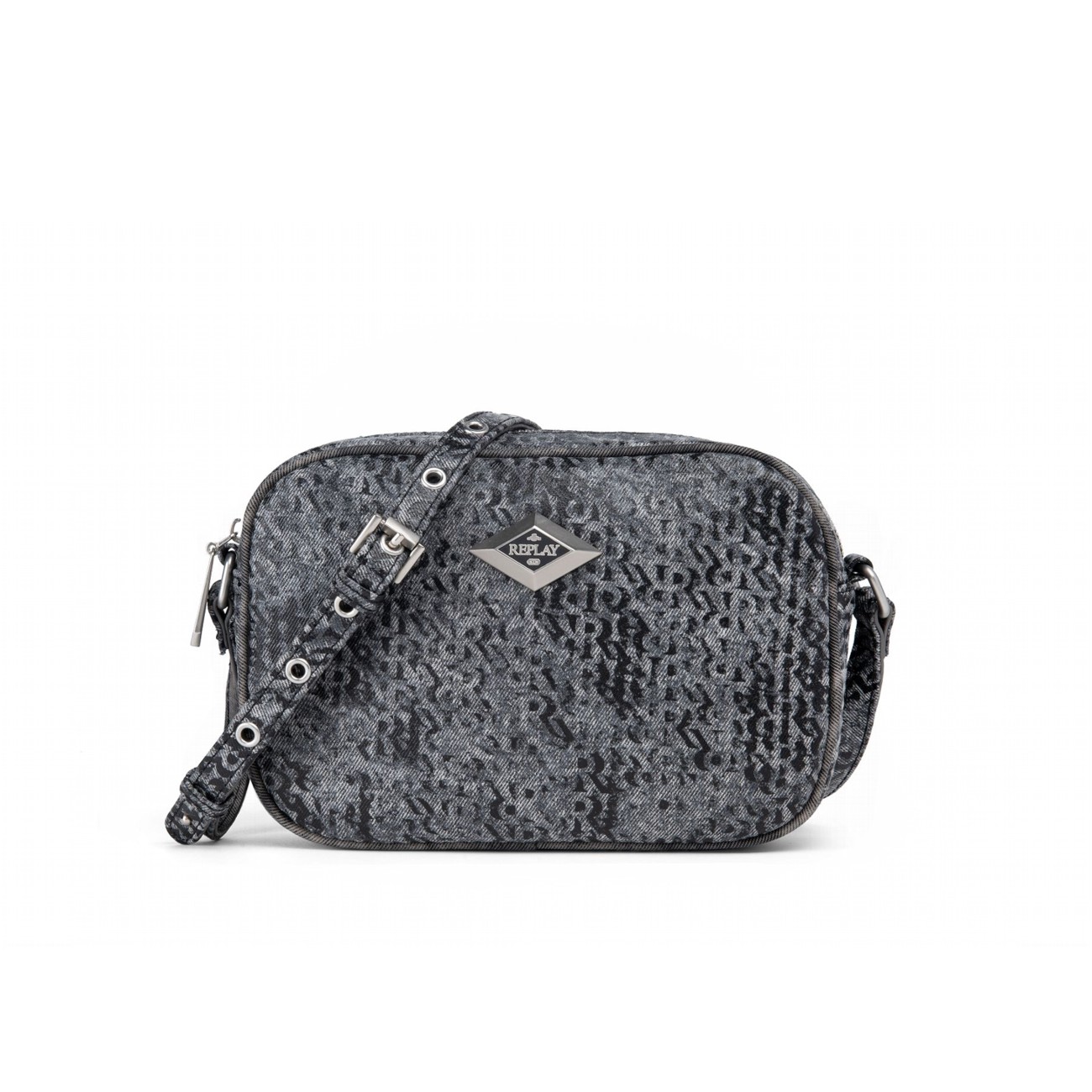 REPLAY WOMEN'S DENIM CAMERA BAG WITH PRINT IN WASHED BLACK+BLACK