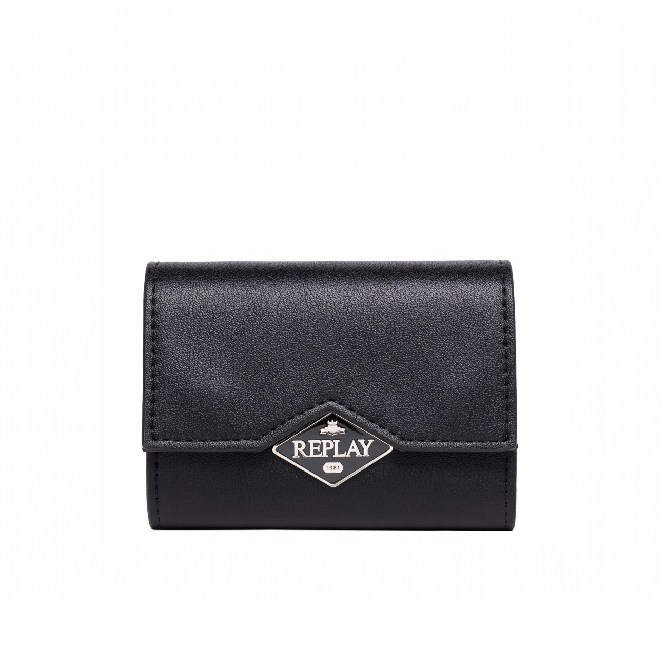 REPLAY WOMEN'S FLAP WALLET WITH DIAMOND LOGO IN BLACK