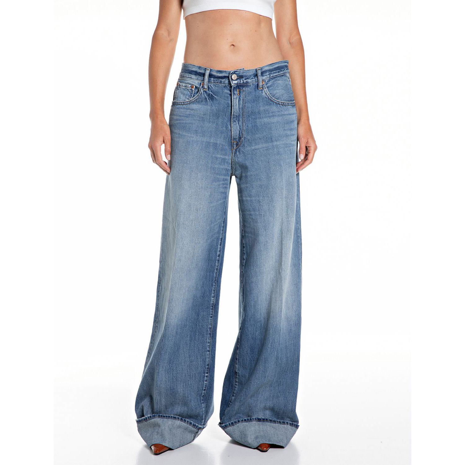 REPLAY WOMEN'S NALAJA WIDE FIT JEANS 12 OZ RECYCLED INDIGO COTTON IN MEDIUM BLUE