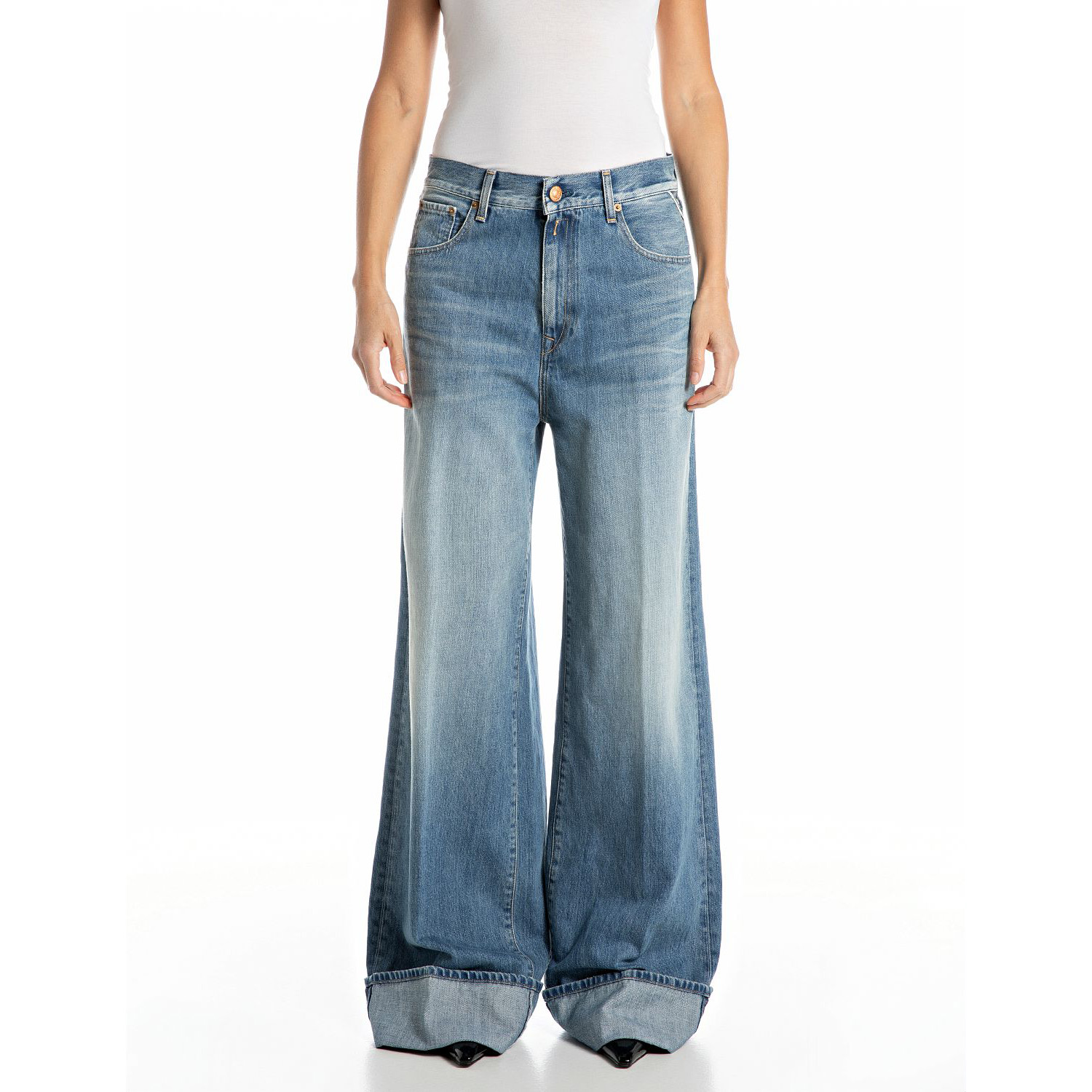 REPLAY WOMEN'S NALAJA WIDE LEG FIT 11 OZ INDIGO COTTON DENIM IN MEDIUM BLUE