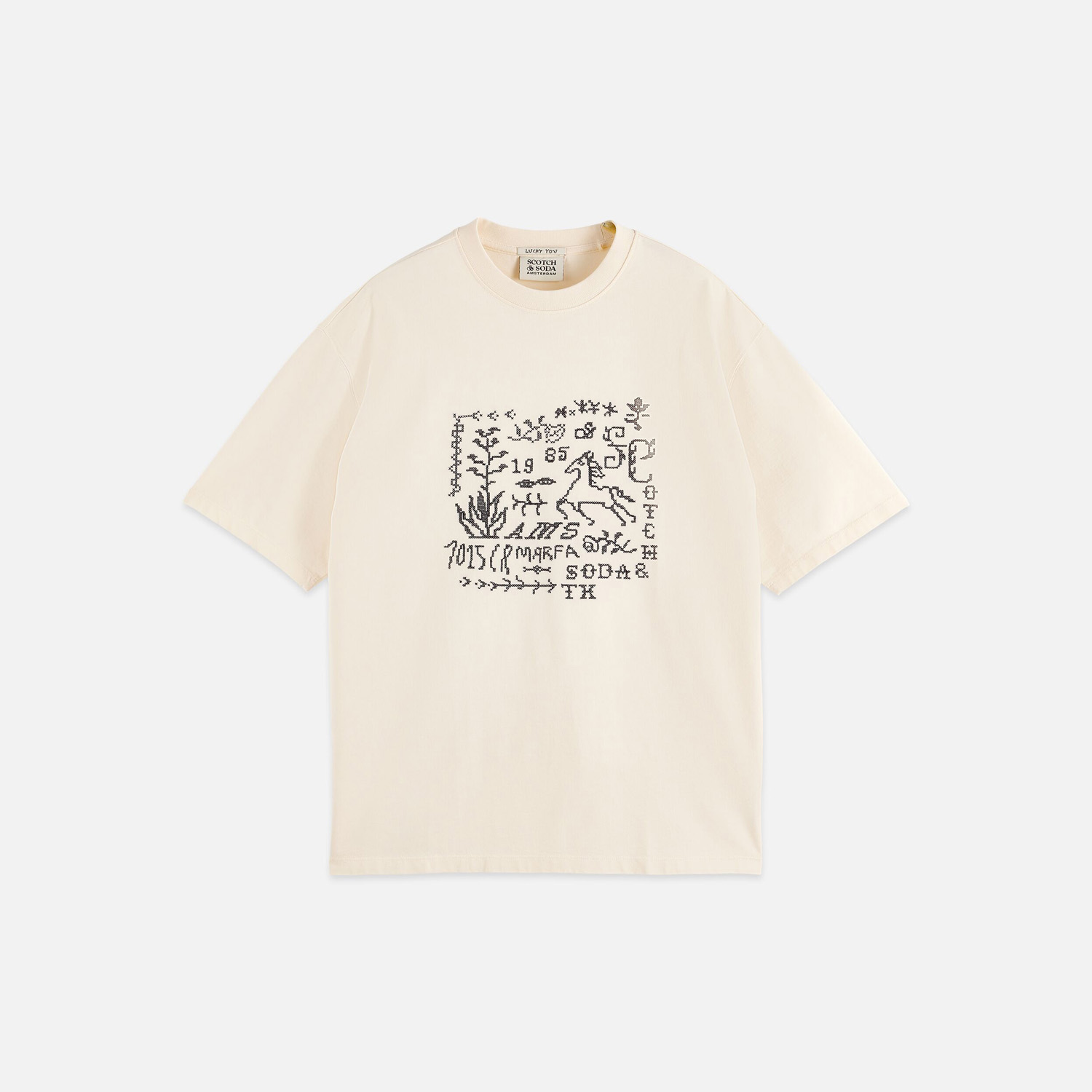 SCOTCH&SODA MEN'S CROSS-STITCHED FRONT ARTWORK LOOSE-FIT T-SHIRT IN LIGHT BEIGE