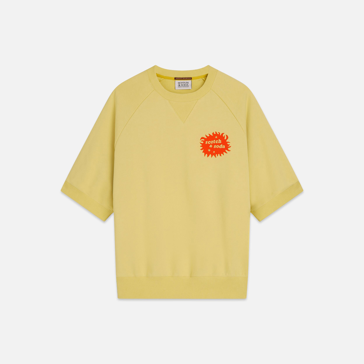 SCOTCH&SODA MEN'S FRONT AND BACK ARTWORK LOOSE FIT SHORT SLEEVE SWEATSHIRT IN BRIGHT YELLOW