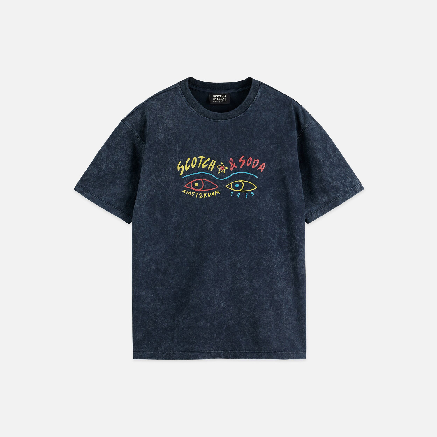 SCOTCH&SODA MEN'S FRONT ARTWORK RELAXED-FIT SNOW-WASHED T-SHIRT IN DARK BLUE