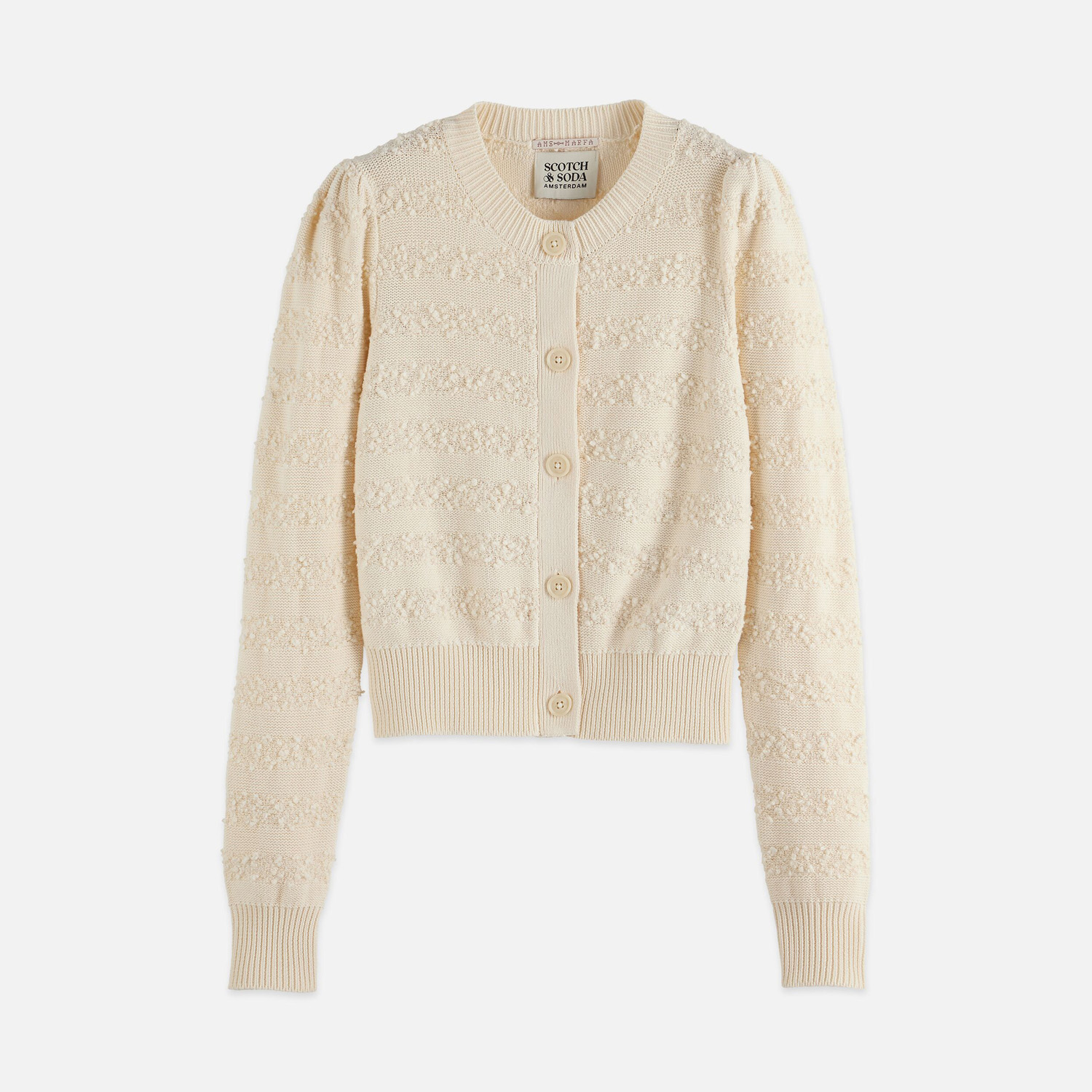 SCOTCH&SODA WOMEN'S BOUCLÉ STRIPE CREW NECK CARDIGAN IN EGGNOG